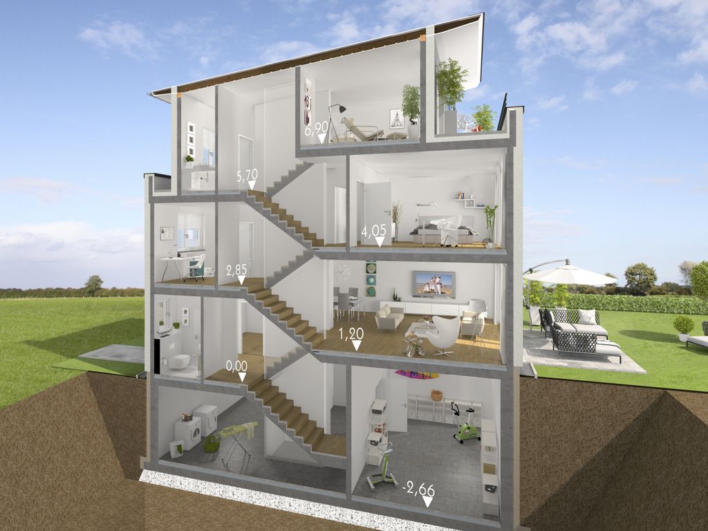 Bei dieser bauweise liegen der hauseingang und die terrasse auf verschiedenen ebenen, befinden sich jedoch immer auf dem gelände.